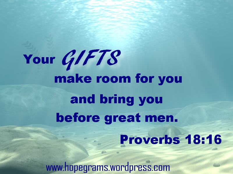 Your GIFTS make room for YOU–WOW what a statement of belief and confirmation. I just became acquainted with this scripture about 2 years ago and more and more people have been saying this to me. I now understand the TRUE meaning of this scripture. God has given everyone various gifts-things that you can use to benefit your life. If we never recognize the gifts that we have been given, we wander around life being unfulfilled. A great example for me is I LOVE to encourage others. So naturally when I had a chance to be on a radio interview, I suddenly came ALIVE!!!! Everyone that hears me on radio, agrees that I was made for Radio. I realized that many times we don’t tap into the GIFTS that we have been given for our benefit. I encourage you today to know–YOUR GIFTS MAKE ROOM FOR YOU!!!!